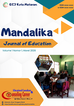 Mandalika: Journal of Education merupakan jurnal ilmiah akses terbuka dan peer-review yang diterbitkan oleh Educational Consultant & Counseling Career (EC3) Mataram. Tujuan penerbitan jurnal ini adalah untuk menyebarluaskan teori-teori baru dan hasil penelitian yang telah dicapai di bidang pendidikan. Berisi Artikel konseptual hasil kajian analitis kritis dan atau artikel hasil penelitian di bidang Pendididkan pada jenjang pendidikan PAUD, SD, SMP, maupun SMA. Jurnal ini menerima Semua topik tentang hasil studi dan penelitian dosen, mahasiswa, guru, praktisi dan ilmuwan di bidang pendidikan. Untuk kategori penelitian, artikel dapat ditulis dengan menggunakan pendekatan kuantitatif dan kualitatif dan dapat dibuat dalam berbagai desain penelitian, seperti penelitian tindakan, eksperimen, dan studi kasus. Terbit dua kali setahun, yaitu pada bulan Maret & September.